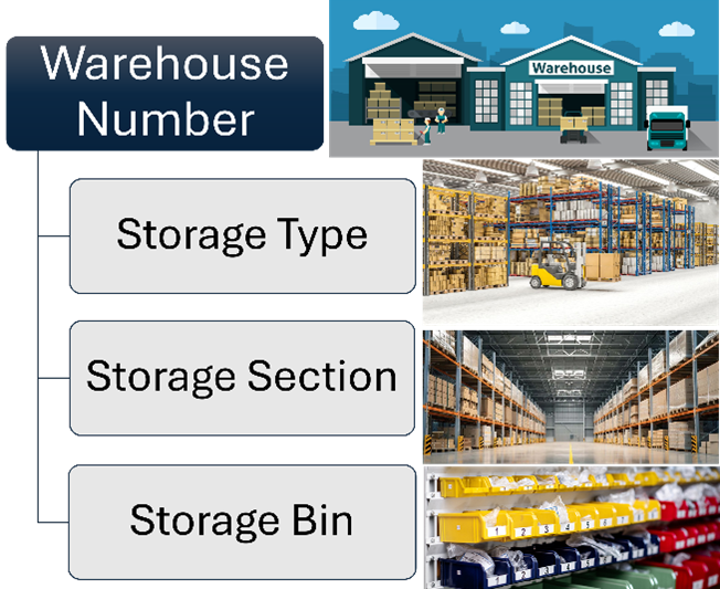 - The storage bin is the smallest unit within the warehouse where products are stored, identified by a coordinate system (e.g., 01-02-03 for aisle, stack, and level).